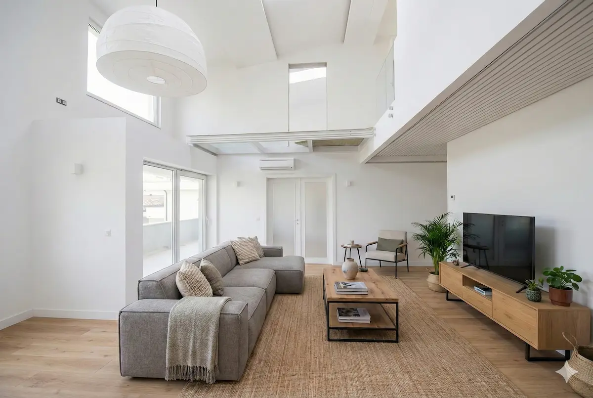 - Base: Se mantuvieron las paredes en blanco puro para maximizar el rebote de la luz natural.